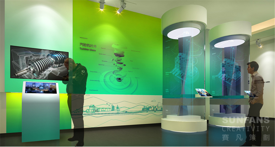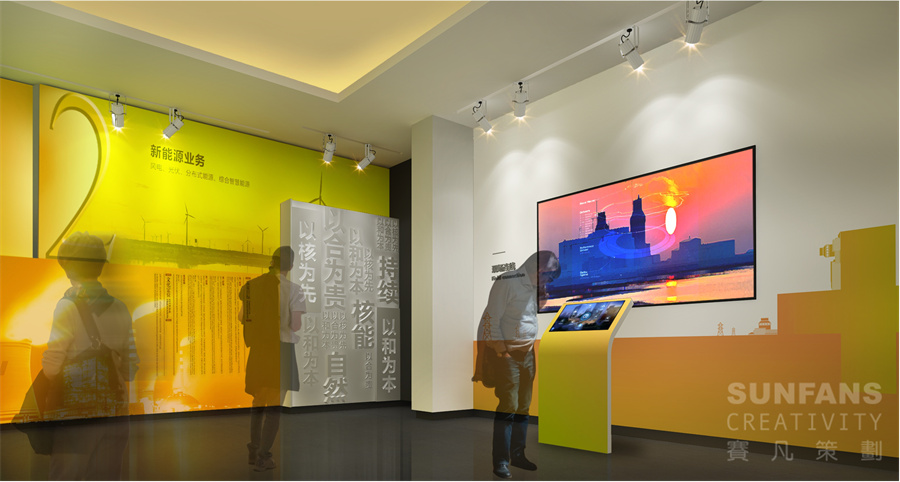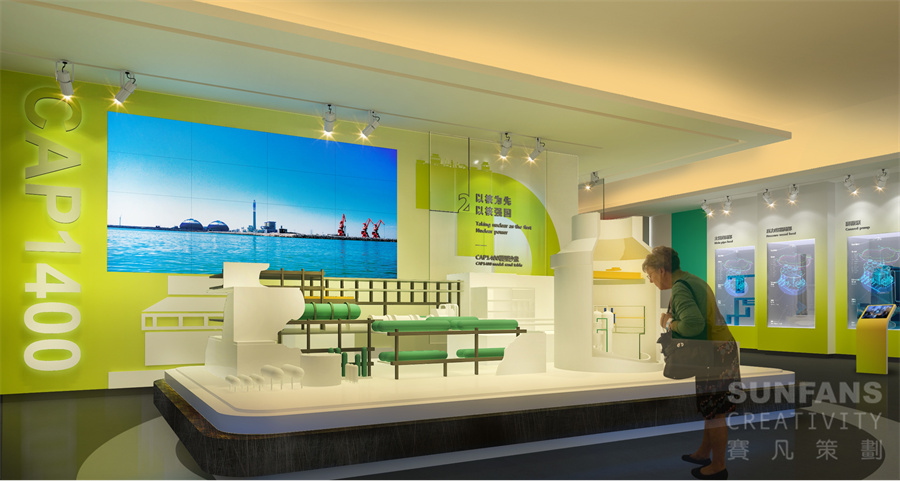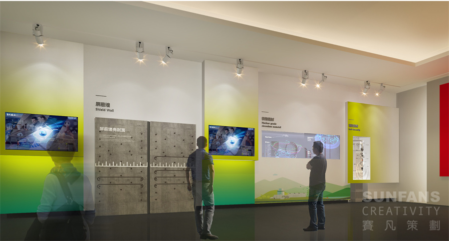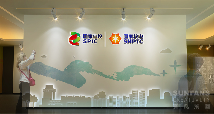 整個(gè)展廳以“合”與“+”作為設(shè)計(jì)元素,意寓著百尺竿頭更進(jìn)一步,將“+”、自然環(huán)保、核電、智慧型城市等元素以畫卷的形式呈現(xiàn)在形象墻上,烘托國(guó)家核電的發(fā)展理念,為整個(gè)展廳奠定了整個(gè)基調(diào)。