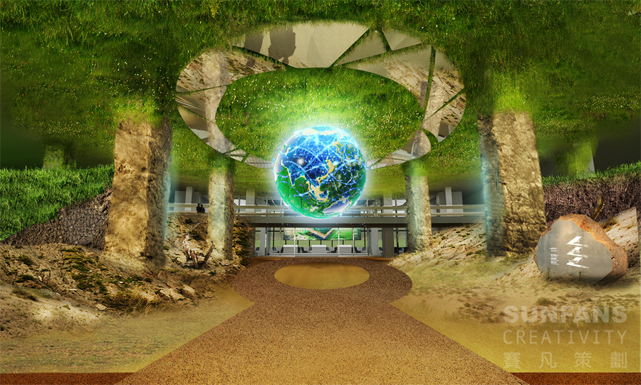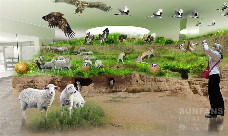 步入序廳,地面頂面大反差景觀造型,將觀眾帶入荒漠化——美麗草原景觀的強(qiáng)烈對(duì)比中,給觀眾以強(qiáng)烈地生態(tài)警示,這既是對(duì)內(nèi)蒙古曾經(jīng)草場(chǎng)退化、荒漠化蔓延的反思,也是對(duì)未來(lái)的警醒。