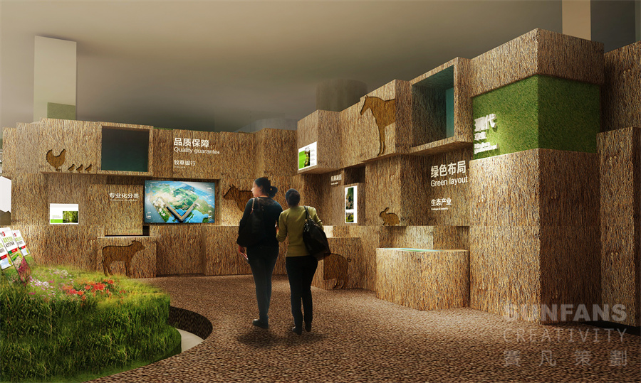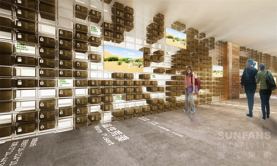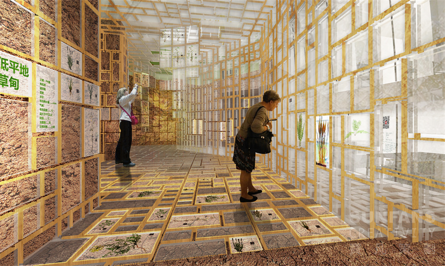 突出“先研究、后修復(fù)”的理念,模仿各類典型的草原生態(tài),展示水樣、土樣、種子、植物標(biāo)本及微生物的生態(tài)數(shù)據(jù),并在區(qū)域的尾端總結(jié)針對(duì)被破壞的土壤進(jìn)行改良、治理的方法和成果。