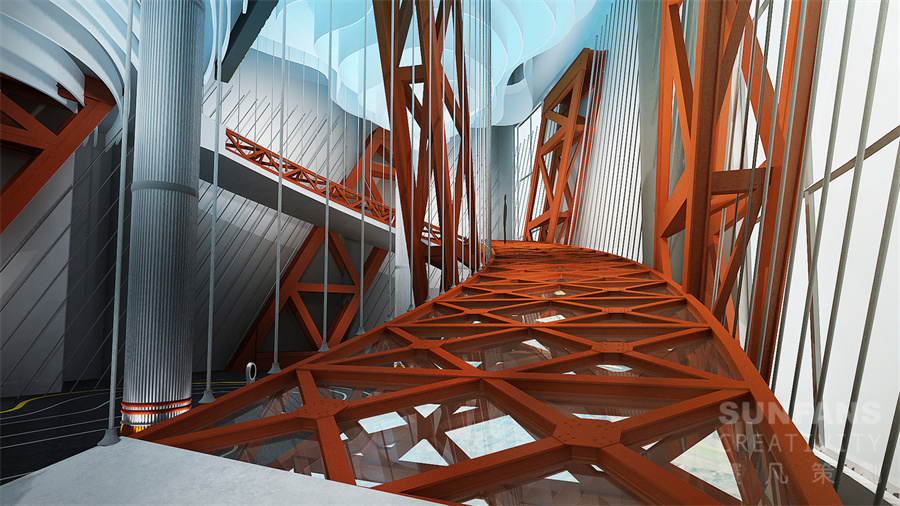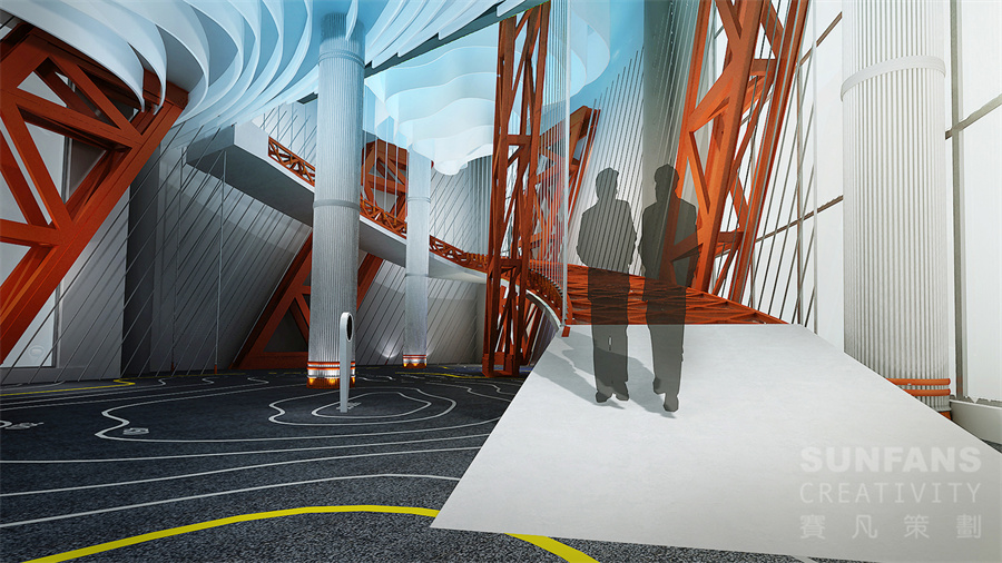 我們拆除了原有的步行梯,轉(zhuǎn)為解構(gòu)、提取橋梁工程的核心要素,用“橋”來搭建一、二層空間的連通坡道,并將橋周邊的自然環(huán)境轉(zhuǎn)化為裝飾性的符號,重新組合形為“橋”的沉浸空間,讓來訪者觸碰橋梁工程的奇跡將成為整館識別性與記憶點的首要感知。