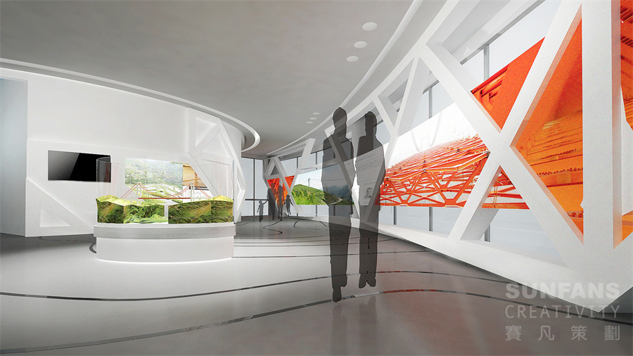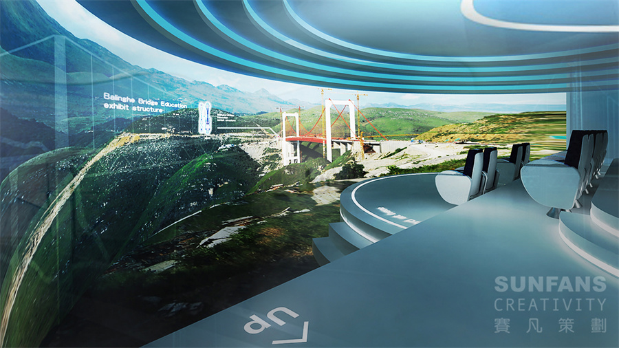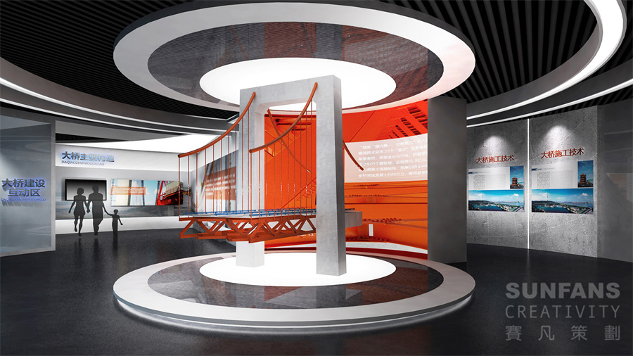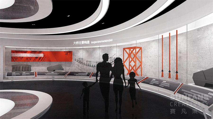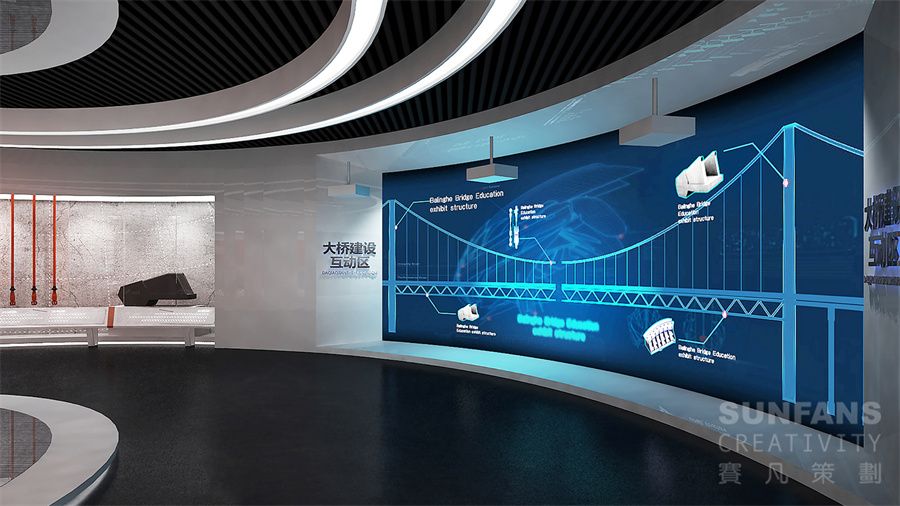 壩陵河大橋橋梁科技博物館坐落在大橋一側(cè)索塔之畔,是大橋整體景觀的重要組成部分,賽凡團隊受托完成館內(nèi)展陳空間的規(guī)劃設計。