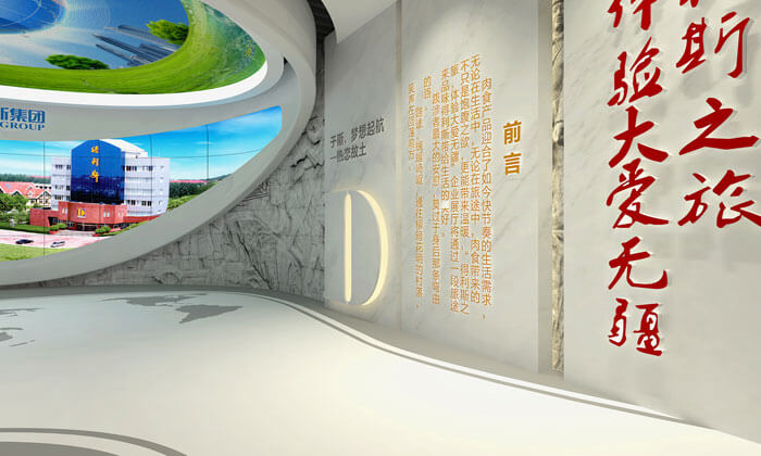 參觀之旅與企業(yè)歷程的美好契合,設(shè)計“得利于斯” 美食之旅的企業(yè)展廳的主線,從得利斯創(chuàng)業(yè)伊始到變革之路,從作坊式生產(chǎn)到肉類企業(yè)龍頭,觀者一路見證集團發(fā)展。