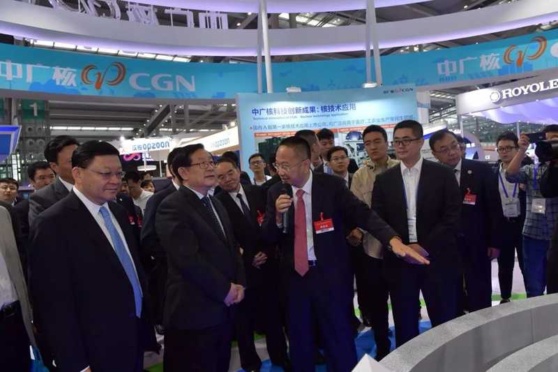 全國政協(xié)副主席、科技部部長萬鋼在中廣核展臺“華龍一號”模型前詳細聆聽工程師講解