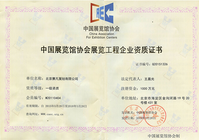 2015年5月,北京賽凡公司取得中國展覽館協(xié)會展覽工程一級資質(zhì)。