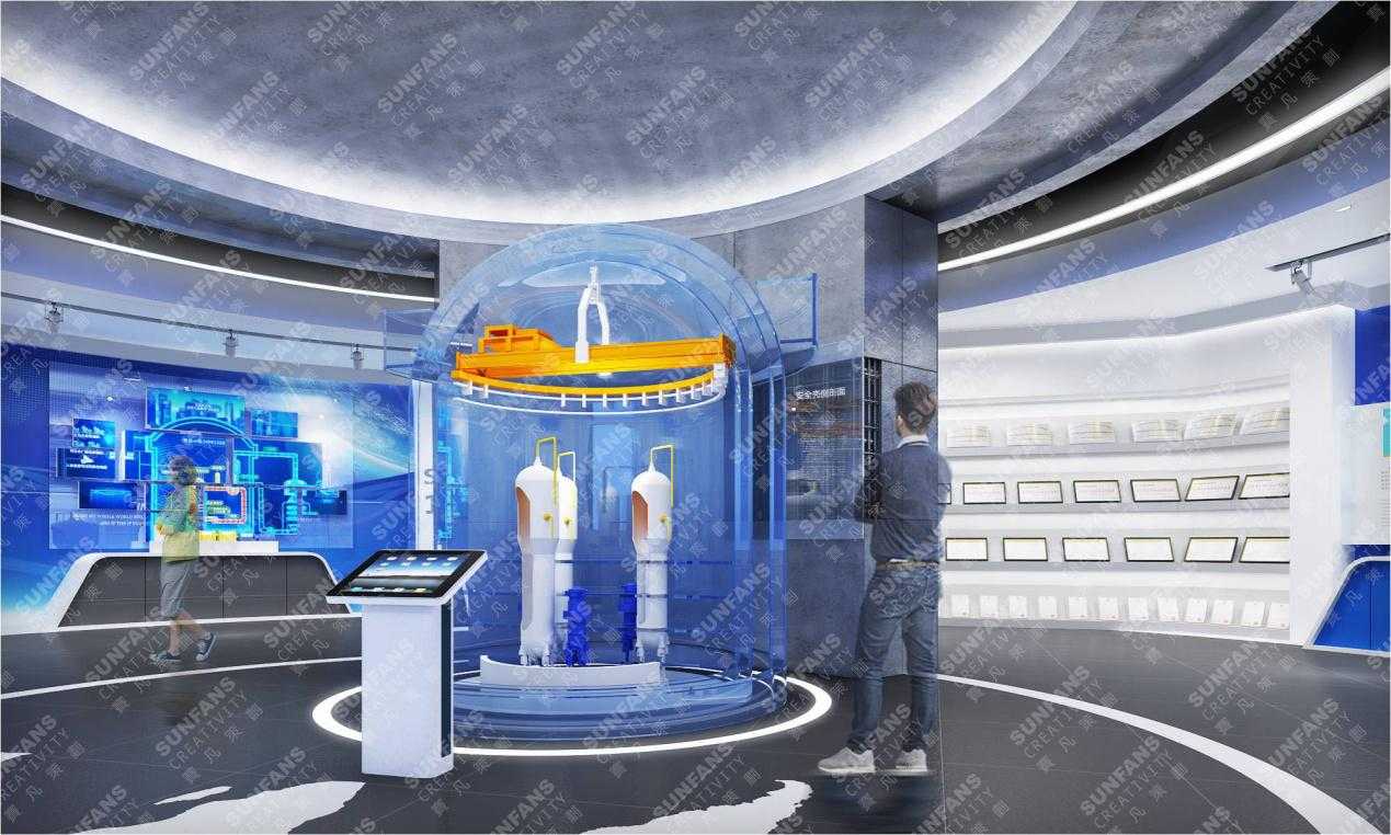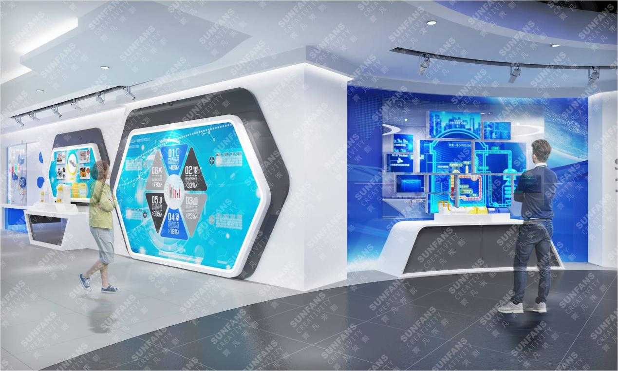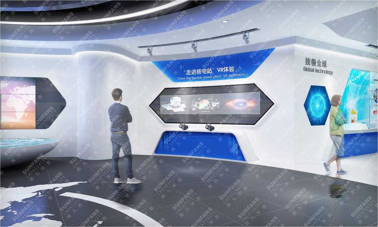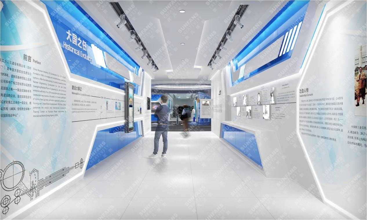在空間色彩風(fēng)格設(shè)計上,以藍(lán)、白主調(diào)形成國際化、科技感的簡約格調(diào),通過運(yùn)用提煉安全核等元素,利用折形的墻面造型營造工業(yè)感,打造中核建專屬展廳,植入更為先進(jìn)的展示手段,以精致的品質(zhì)感,融入VR互動,三位一體沙盤等科技展項。