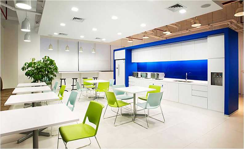 明亮的休息室整體以白色與藍色為主,為員工打造一種安靜、舒服的休息環(huán)境?,F(xiàn)代化的桌椅與墻體的顏色保持一致,這都可以讓員工可以產(chǎn)生愉快的心情。明快的色調(diào)也起到了增添室內(nèi)采光的效果,達到更好的生機的視覺效果。