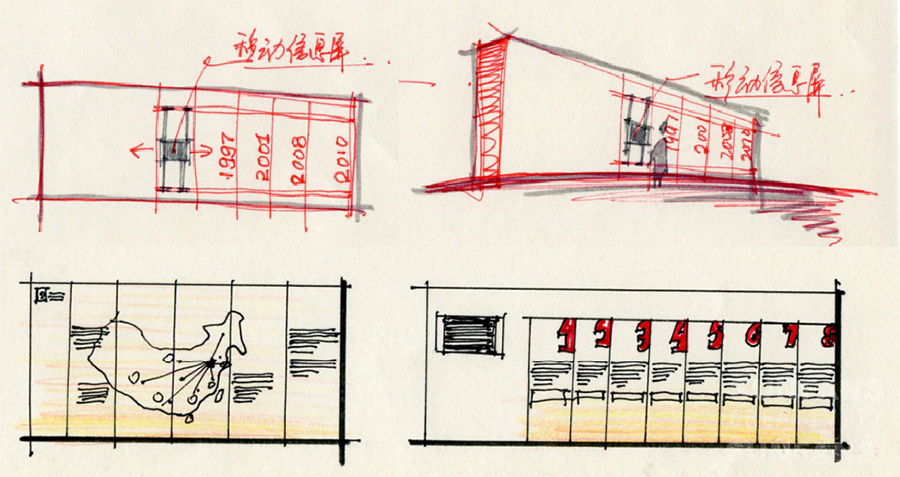 展廳位于銷售處內(nèi)部邊角非主要人流位置,所以在參觀路線設置上需要以人為引導參觀為主,對展覽形式的選擇制約比較大。