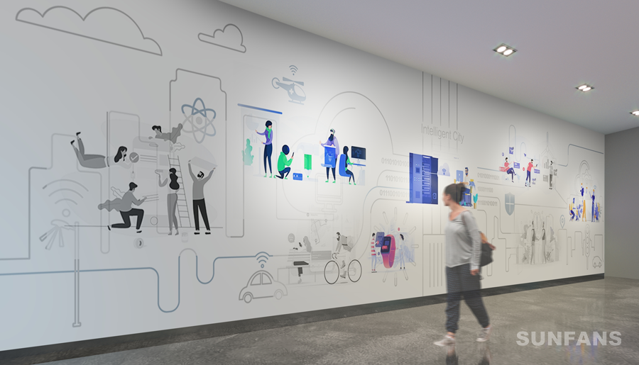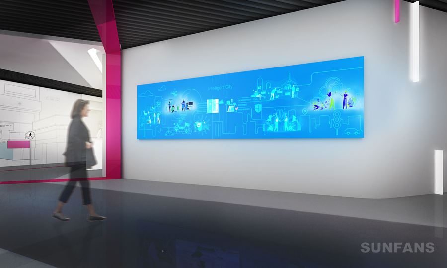 油墨導(dǎo)電互動墻通過近距離觸控識別,墻面正前方安裝兩臺高清投影儀,墻面正上方是雷達(dá)感應(yīng)器,參觀者用手觸碰墻面上的貼圖或投影畫面,靜態(tài)墻面開始發(fā)光/發(fā)聲,觸摸到相應(yīng)區(qū)域時立刻出現(xiàn)相應(yīng)的文字、視頻、動畫等內(nèi)容,原先單一的靜態(tài)墻面瞬間“活”過來,呈現(xiàn)一幅內(nèi)容豐富的絢麗畫面。