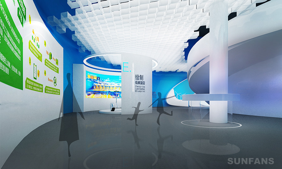 數(shù)字展廳頂棚空間具有可變性,應(yīng)該利用這一特性在合適的局部創(chuàng)造出各種富有變化的空間造型組成要素。頂棚展臺搭建材料的運(yùn)用應(yīng)該盡量在同一層,以一到兩種為主在統(tǒng)一中求變化。另外,賽凡策劃設(shè)計(jì)師在數(shù)字展廳設(shè)計(jì)時(shí)除要考慮其本身材料的屬性、造型、色彩特性,還要考慮打具的設(shè)計(jì)和布置與藝術(shù)效果的關(guān)系;還要注意以恰當(dāng)?shù)某叨群蜆?gòu)圖方式等進(jìn)行美化。