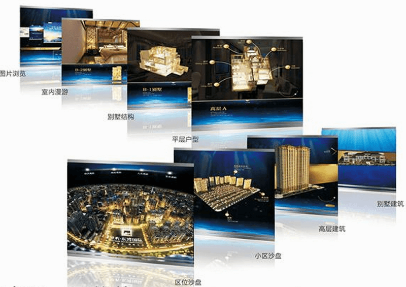 多媒體互動桌:通過多點觸控技術(shù),將樓盤圖形及戶型用人機(jī)交互的方式展示,客戶可以隨意地拉大縮小相關(guān)圖片,還能實現(xiàn)720°全景瀏覽,使客戶對將來家園的狀況一覽無余。