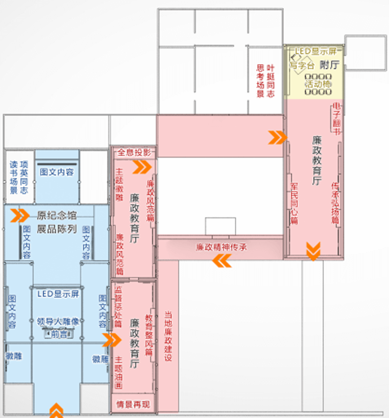 參觀線路:參觀路線設定從教育館的正門入口進入,順時針依次參觀雕像、LED屏幕、原紀念館展品、廉政教育廳和廉政精神傳承、當?shù)亓ㄔO等內(nèi)容。