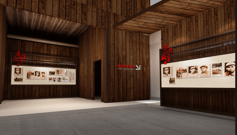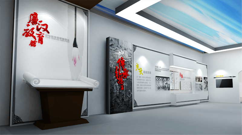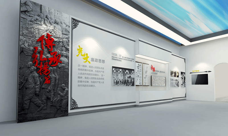 平面布局:根據(jù)古建筑的現(xiàn)場情況進行設計,更充分、合理的利用展示空間。將紀念館的前院作為序廳,前廳展示了新四軍將領(lǐng)雕像及將領(lǐng)生平的圖文內(nèi)容,并設置了大型的LED屏幕。后廳將原紀念館的內(nèi)容加以整理編排,做集中展示。三間大屋用作廉政教育館,前兩間展示教育整風篇和監(jiān)督懲處篇,后面一間展示軍民同心篇和傳承弘揚篇。連接前后屋的過廊,分別展示了廉政精神傳承及徽州區(qū)政府廉政建設的重要活動等內(nèi)容,并在廉政教育廳內(nèi)設置了附廳。