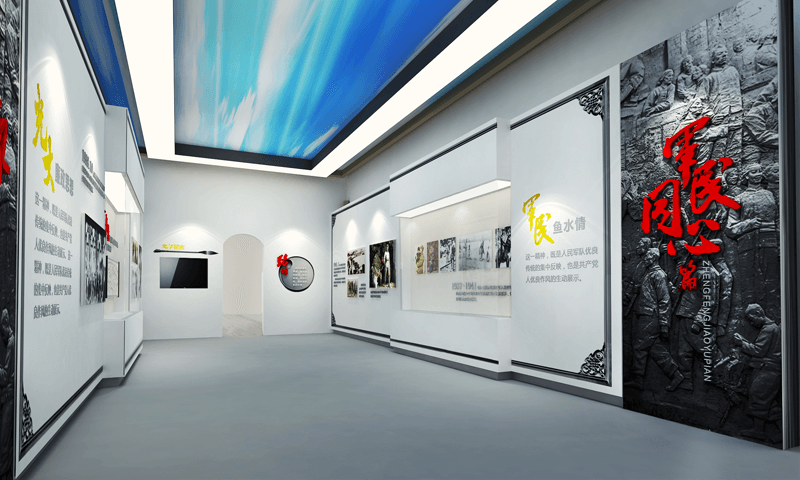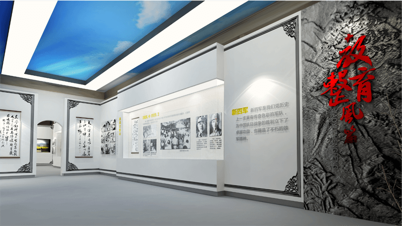 展廳設計的整體色調(diào)取自徽派建筑的灰白,加入象征軍魂的紅色,即蘊含了藝術(shù)創(chuàng)意美學,又表現(xiàn)出新四軍“一清二白”的崇高思想境界,和廉潔自律的鐵軍精神。