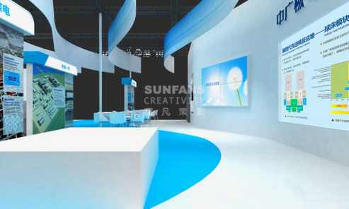 配合本次展覽“科技創(chuàng)新、合作共贏、安全發(fā)展”的主題,以及此次中廣核以ACPR1000核電技術模型為核心的展示要求,以海浪為主要元素,搭配充滿科技感的藍色,彰顯此次展覽科技創(chuàng)新的主題。